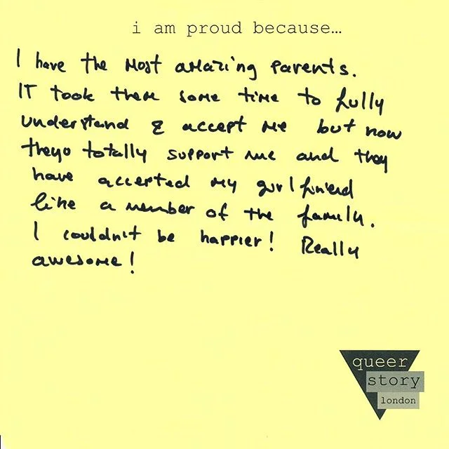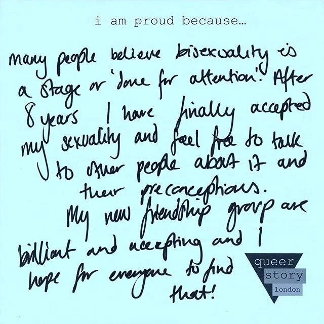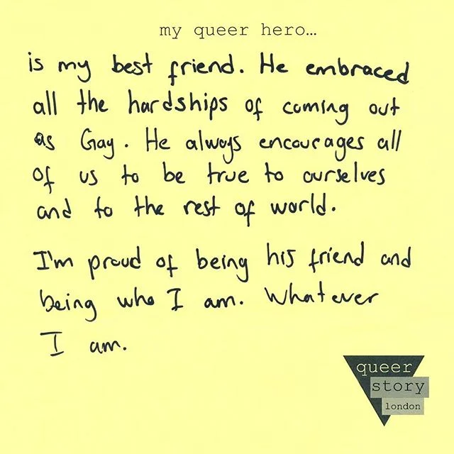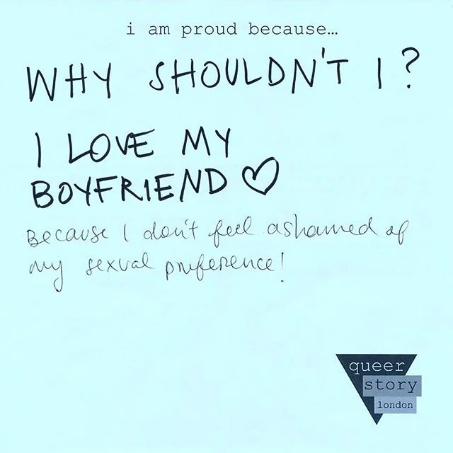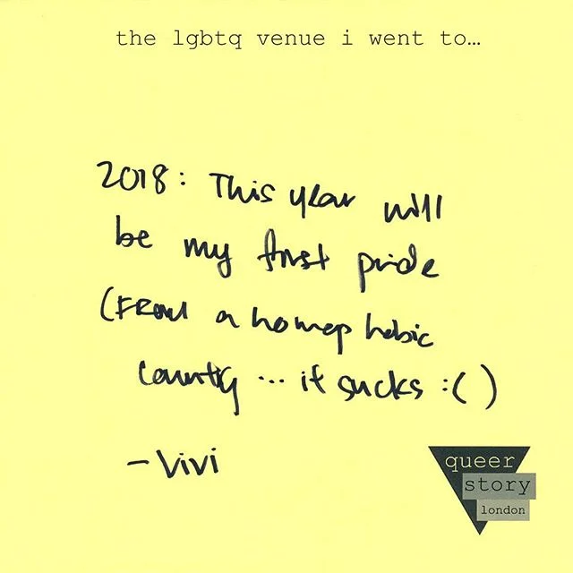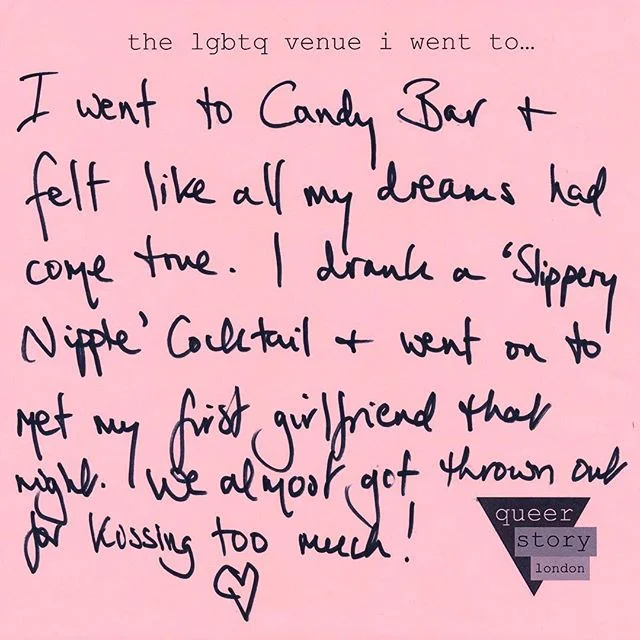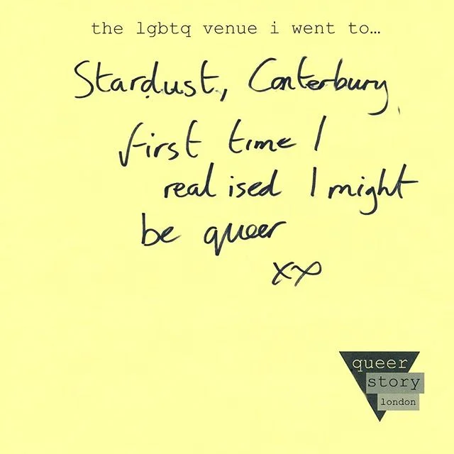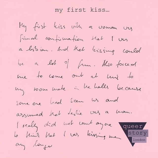 The What's your queer story? project was launched in June 2018. Visitors to events at the Tate Modern and Science Museum were invited to fill in paper slips with a handwritten memory of their LGBTQ+ experience, which they then posted into a 'Queer Memory Box'. The selection below is shared anonymously with permission of the contributors, and more are being added regularly on Instagram. Based on geographical relevance the original paper slips will be donated to the local borough archives around London. It is planned to collect stories at further events and expand the project to allow contributions via other interested organisations and online (please get in touch if you would like to be involved). More information on the launch can be found at Gar Star News.