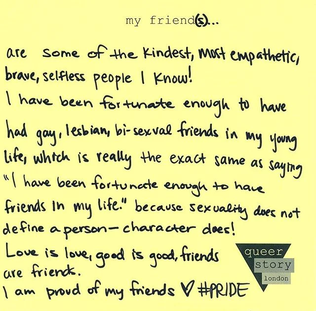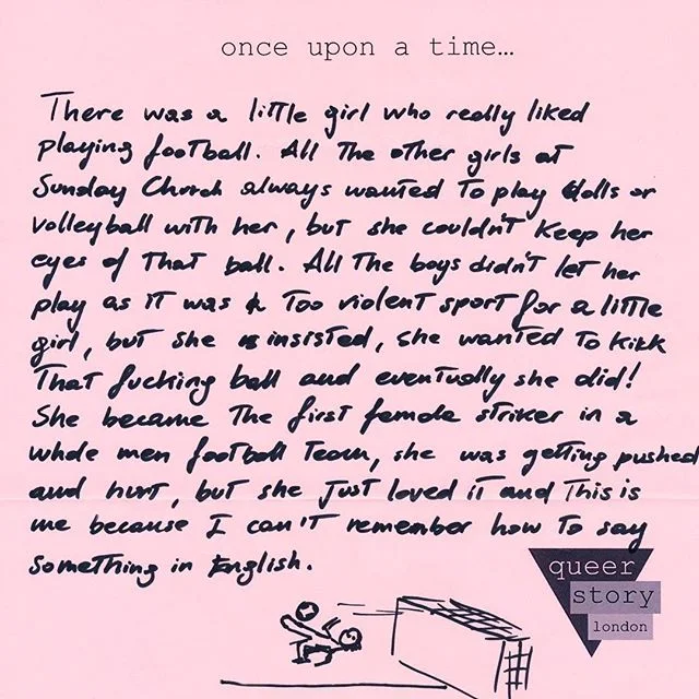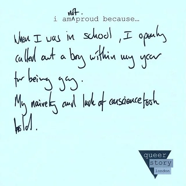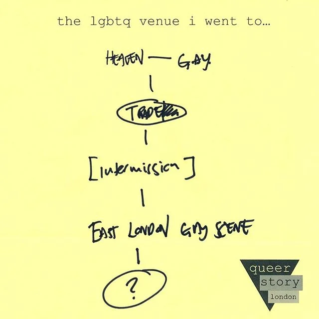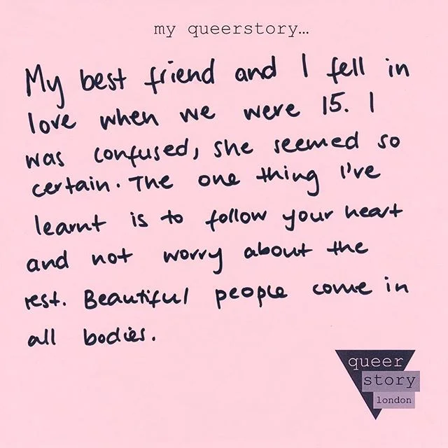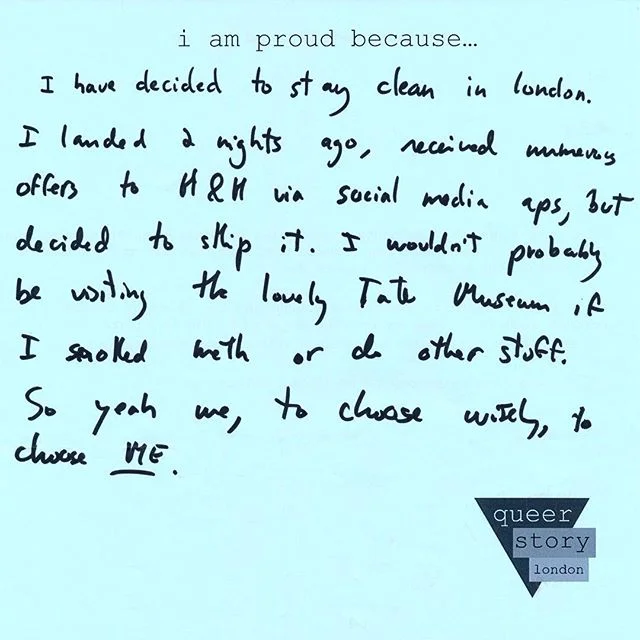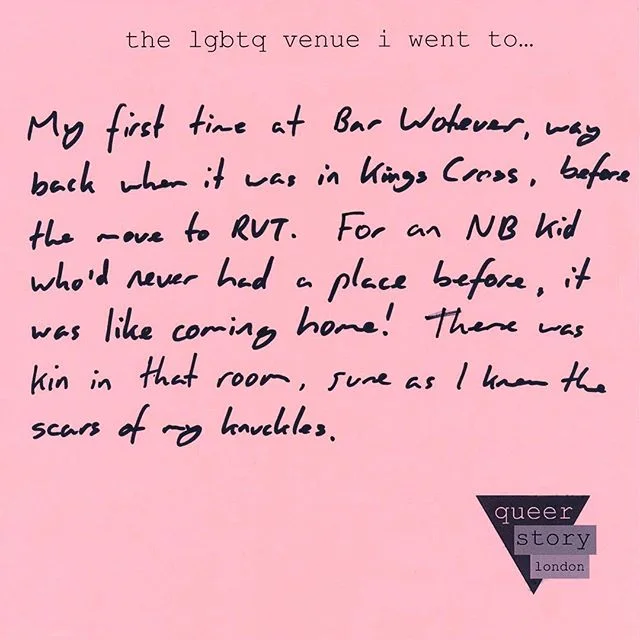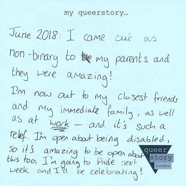 The What's your queer story? project was launched in June 2018. Visitors to events at the Tate Modern and Science Museum were invited to fill in paper slips with a handwritten memory of their LGBTQ+ experience, which they then posted into a 'Queer Memory Box'. The selection below is shared anonymously with permission of the contributors, and more are being added regularly on Instagram. Based on geographical relevance the original paper slips will be donated to the local borough archives around London. It is planned to collect stories at further events and expand the project to allow contributions via other interested organisations and online (please get in touch if you would like to be involved). More information on the launch can be found at Gar Star News.